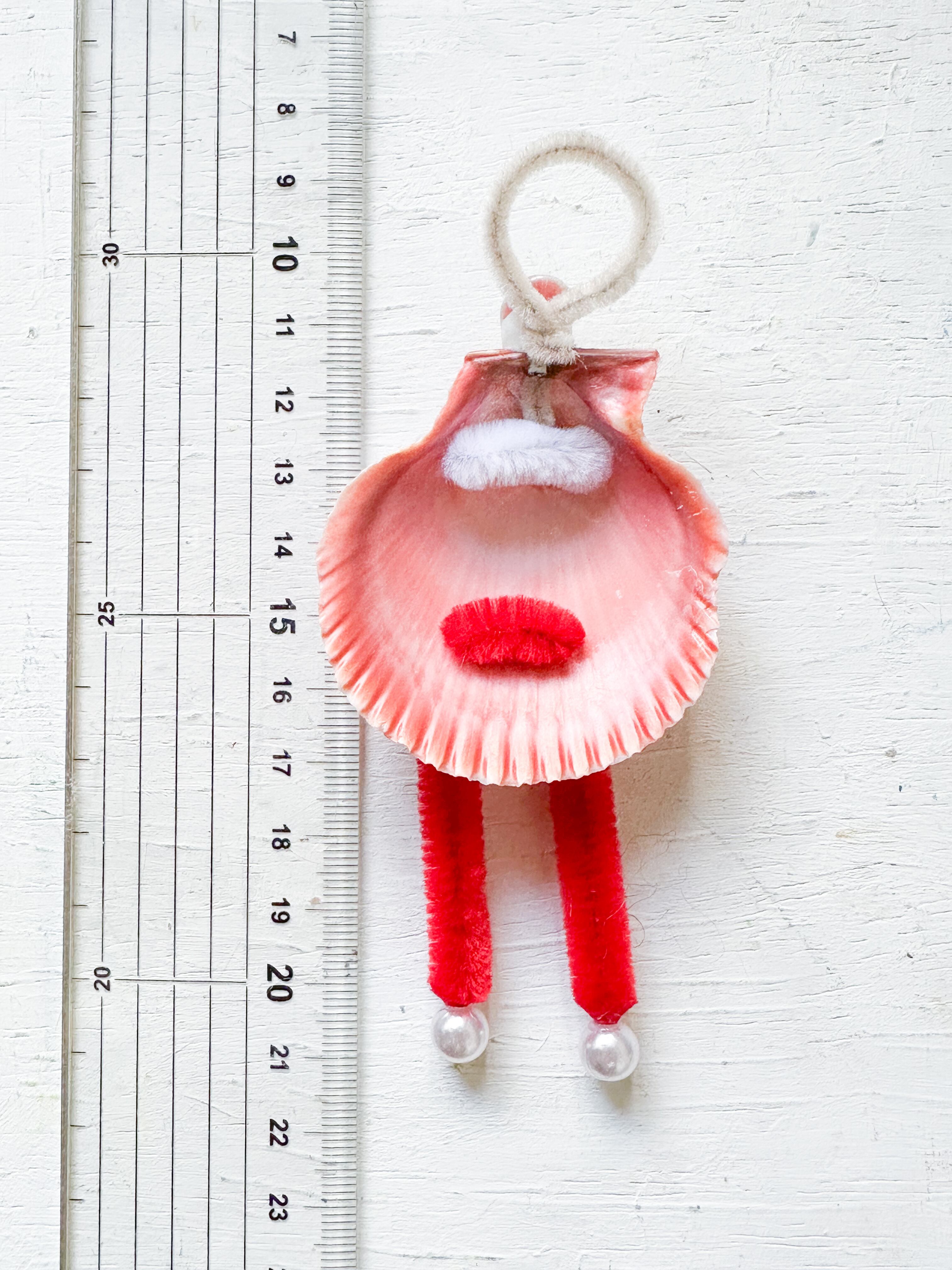 貝殻でクリスマス感ある海の妖精のオーナメントをつくりました。貝殻のボディにモールの手足が付いています。サイズ感はそれぞれの画像よりご確認ください。