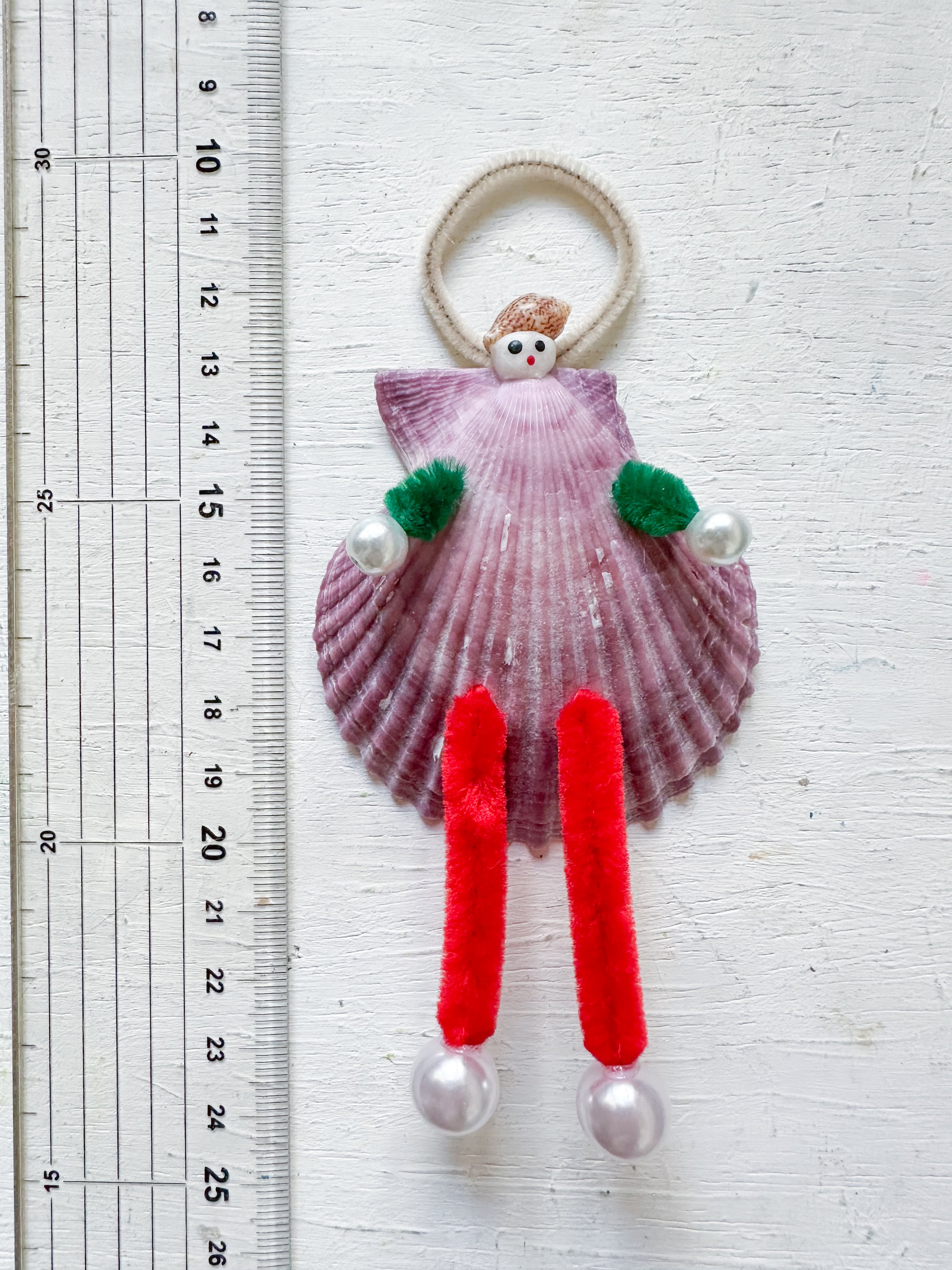 貝殻でクリスマス感ある海の妖精のオーナメントをつくりました。貝殻のボディにモールの手足が付いています。サイズ感はそれぞれの画像よりご確認ください。