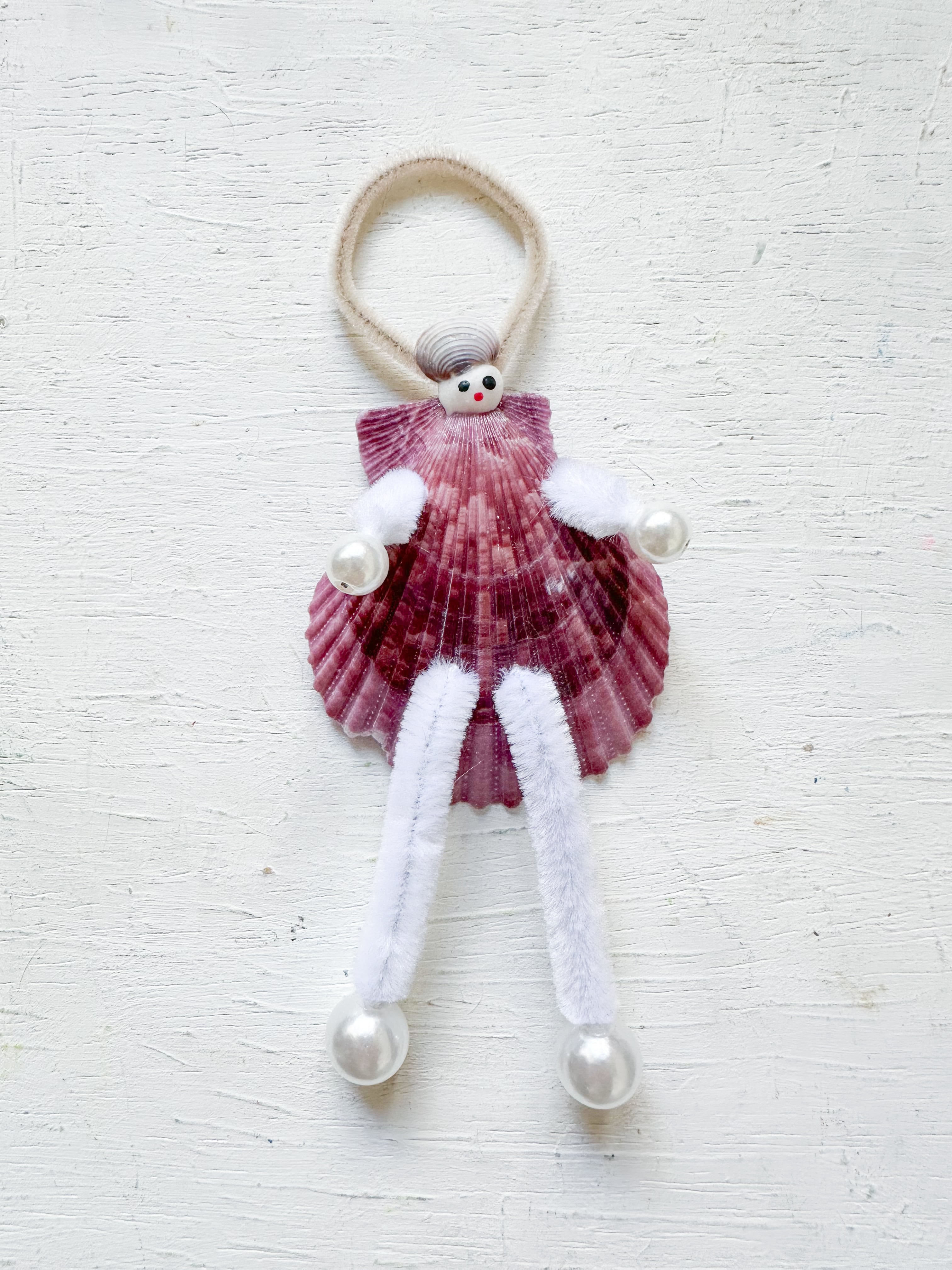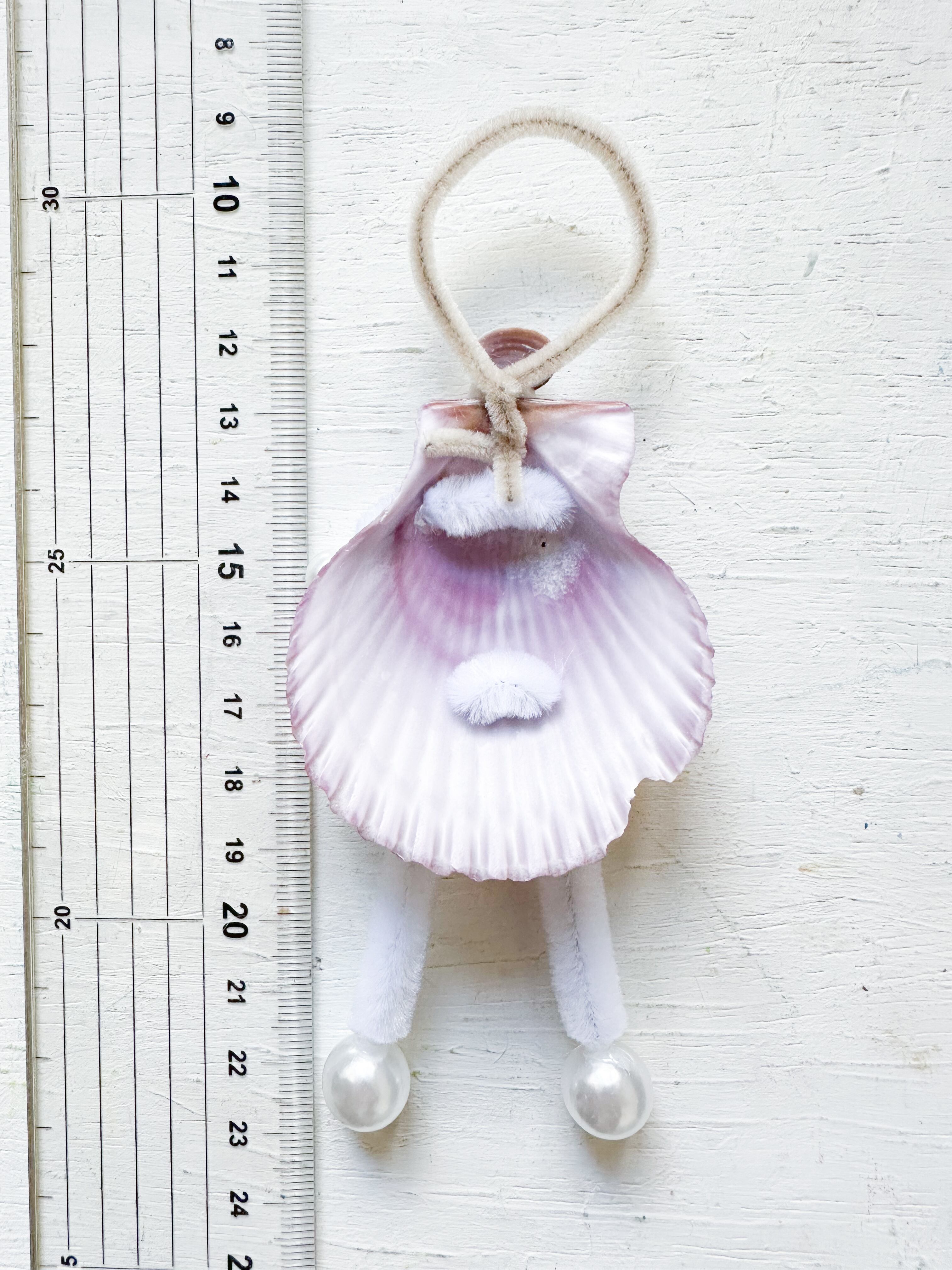 貝殻でクリスマス感ある海の妖精のオーナメントをつくりました。貝殻のボディにモールの手足が付いています。サイズ感はそれぞれの画像よりご確認ください。