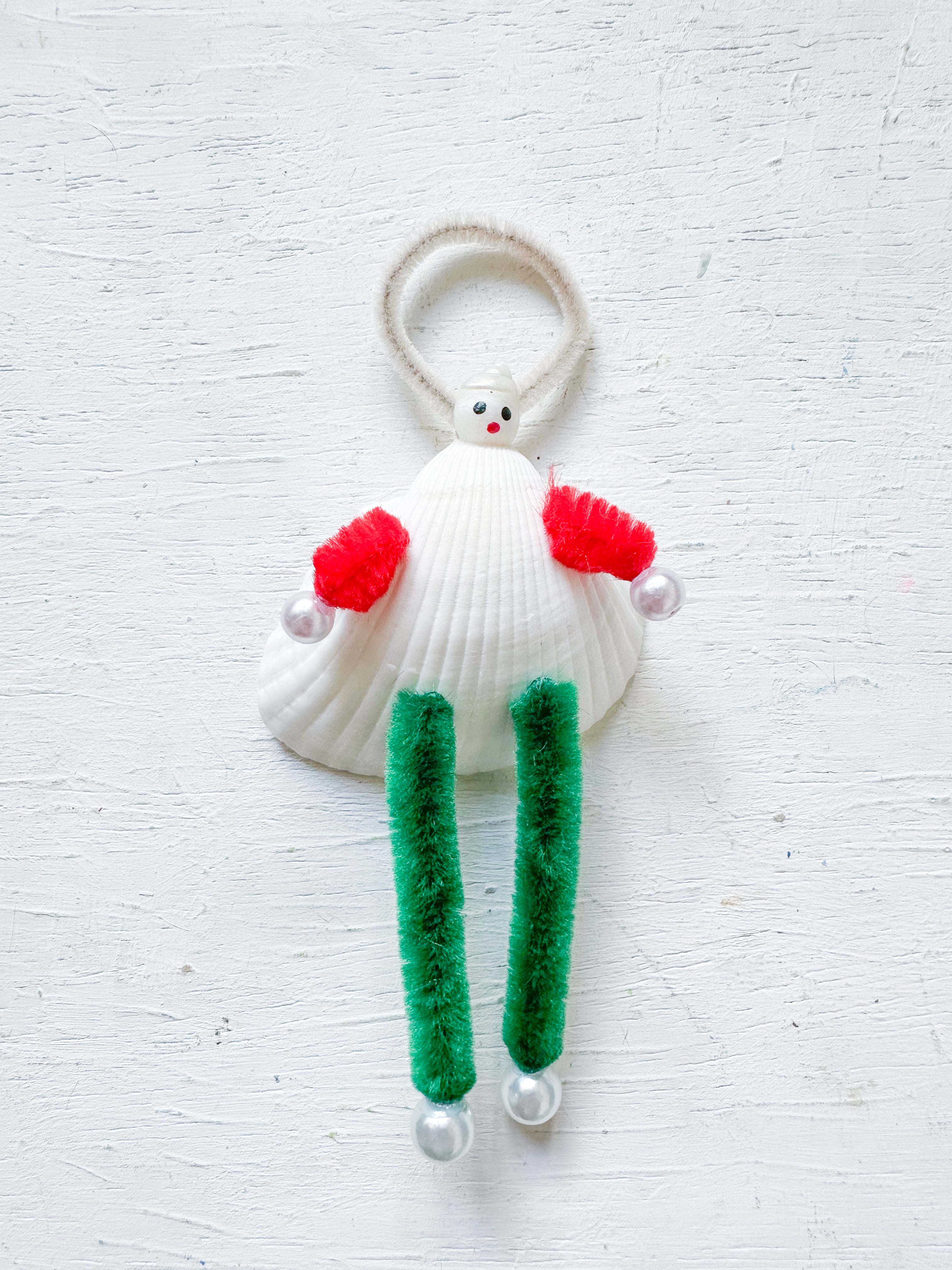 貝殻でクリスマス感ある海の妖精のオーナメントをつくりました。貝殻のボディにモールの手足が付いています。サイズ感はそれぞれの画像よりご確認ください。