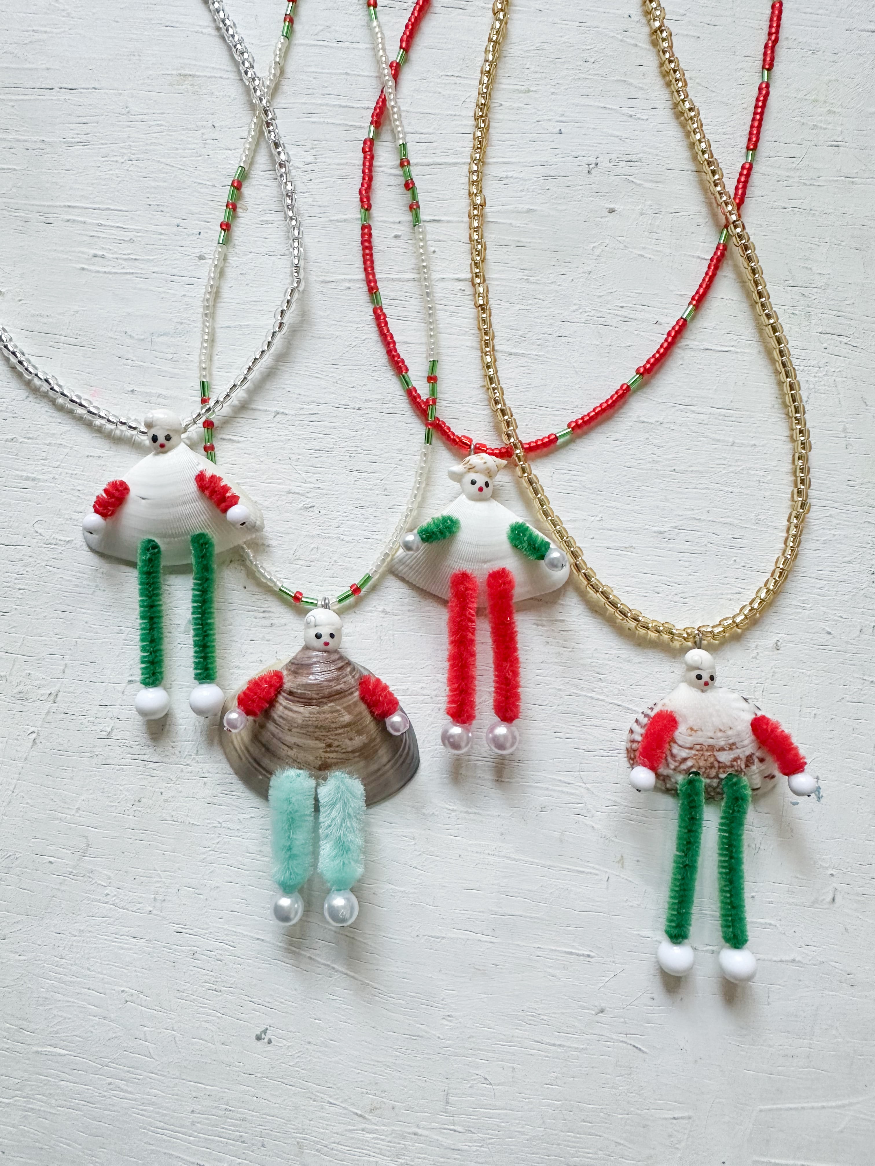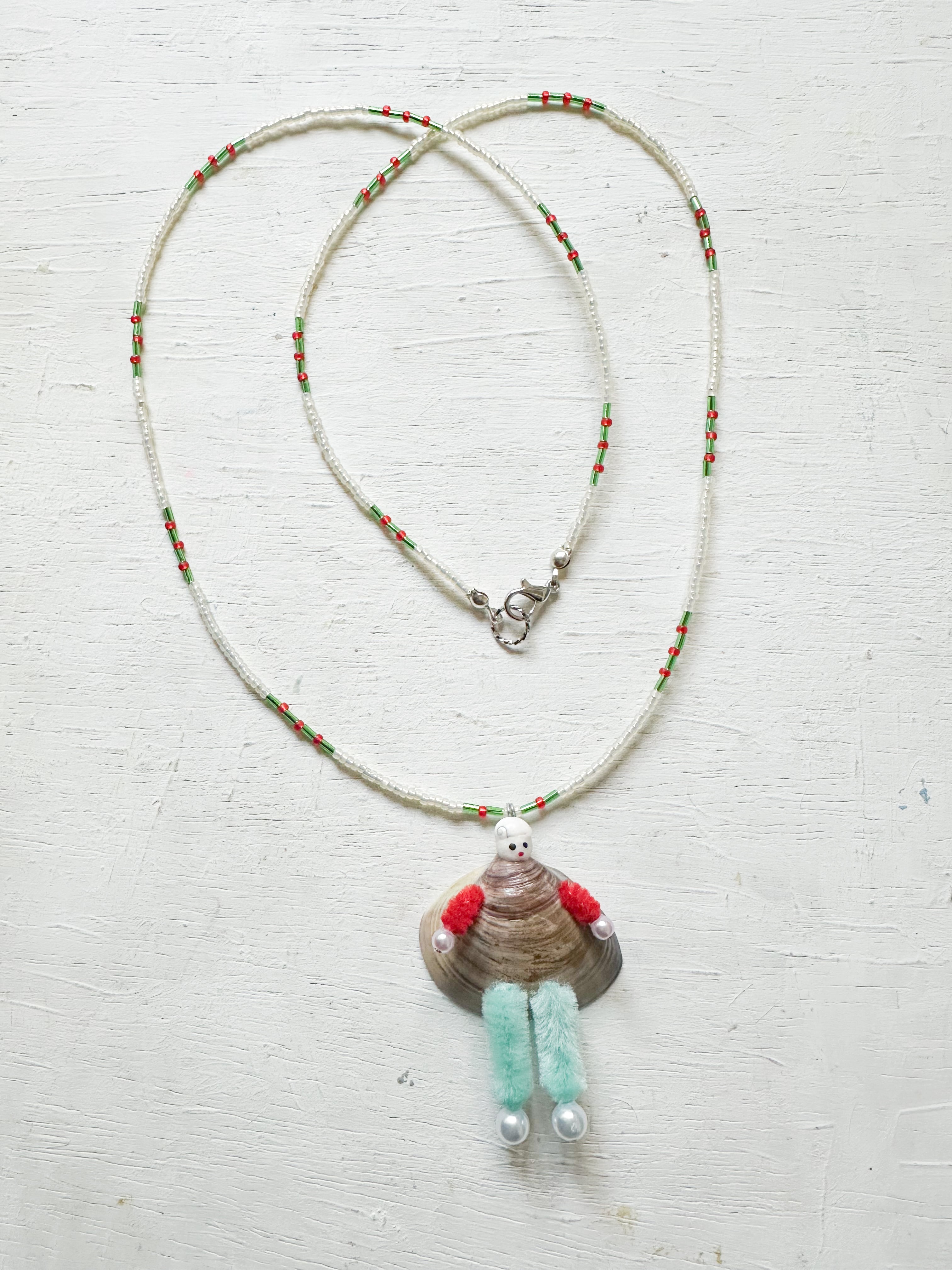 貝殻でクリスマス感ある海の妖精のペンダントネックレスをつくりました。クリスマスセーターに通ずるような“ダサ可愛い”あの感じが大好きなので表現してみました。ネックレス部分は小さなビーズを使い、ペンダントは貝殻のボディにモールの手足がついています。