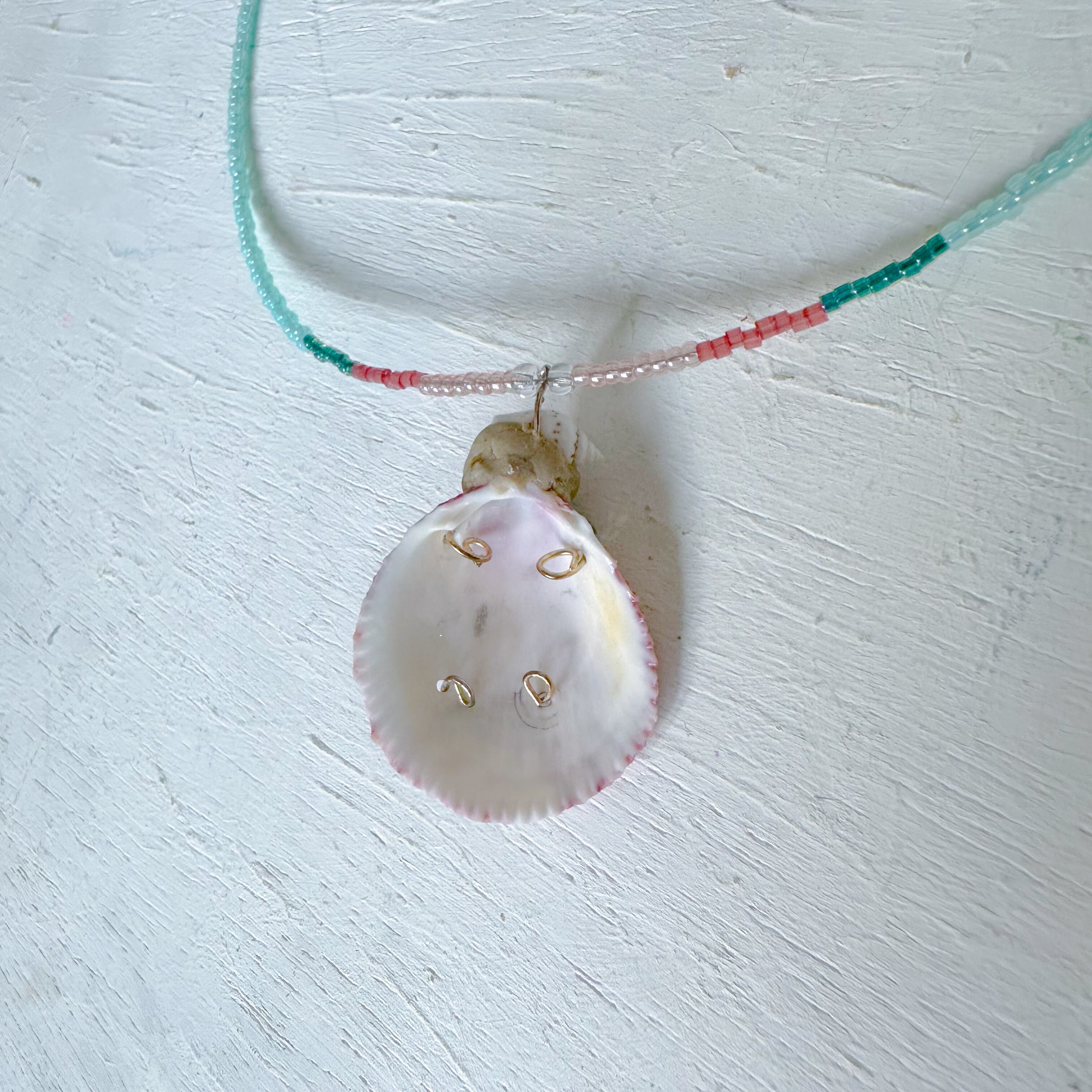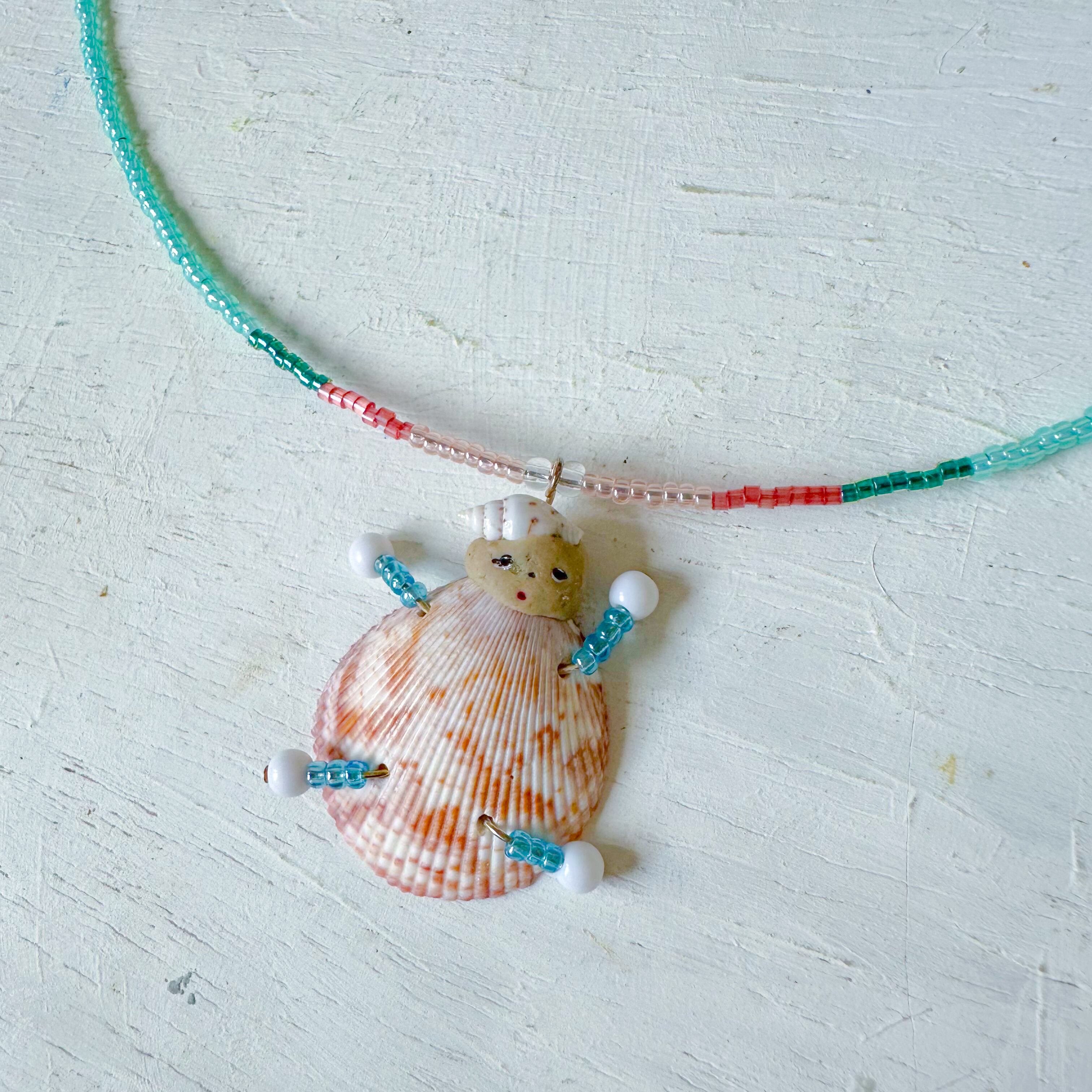 貝殻で海の妖精のペンダントモチーフをつくり、ビーズを連ねてネックレスにしました。