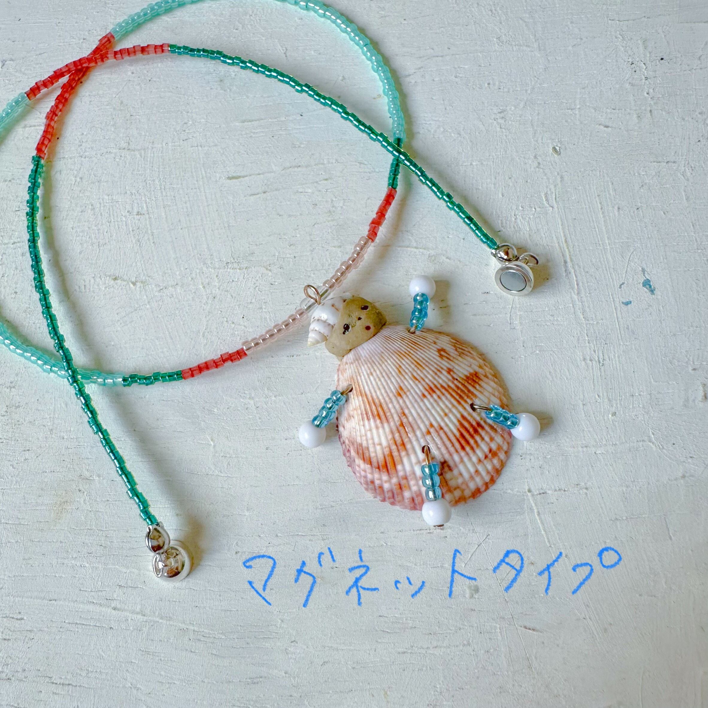 貝殻、ガラスビーズ、金属パーツ(留め具:マグネット)、エポキシ樹脂、アクリル絵の具、