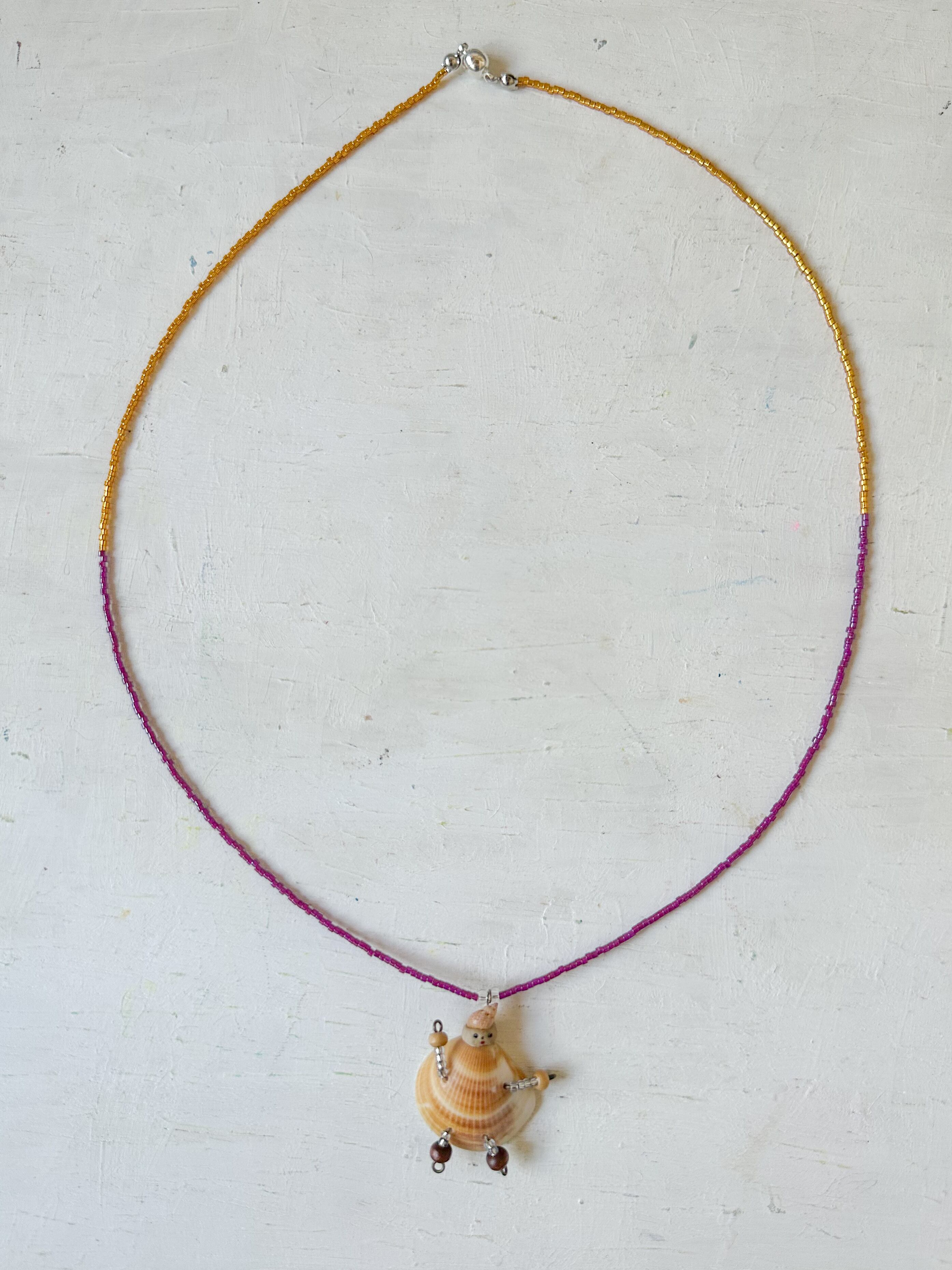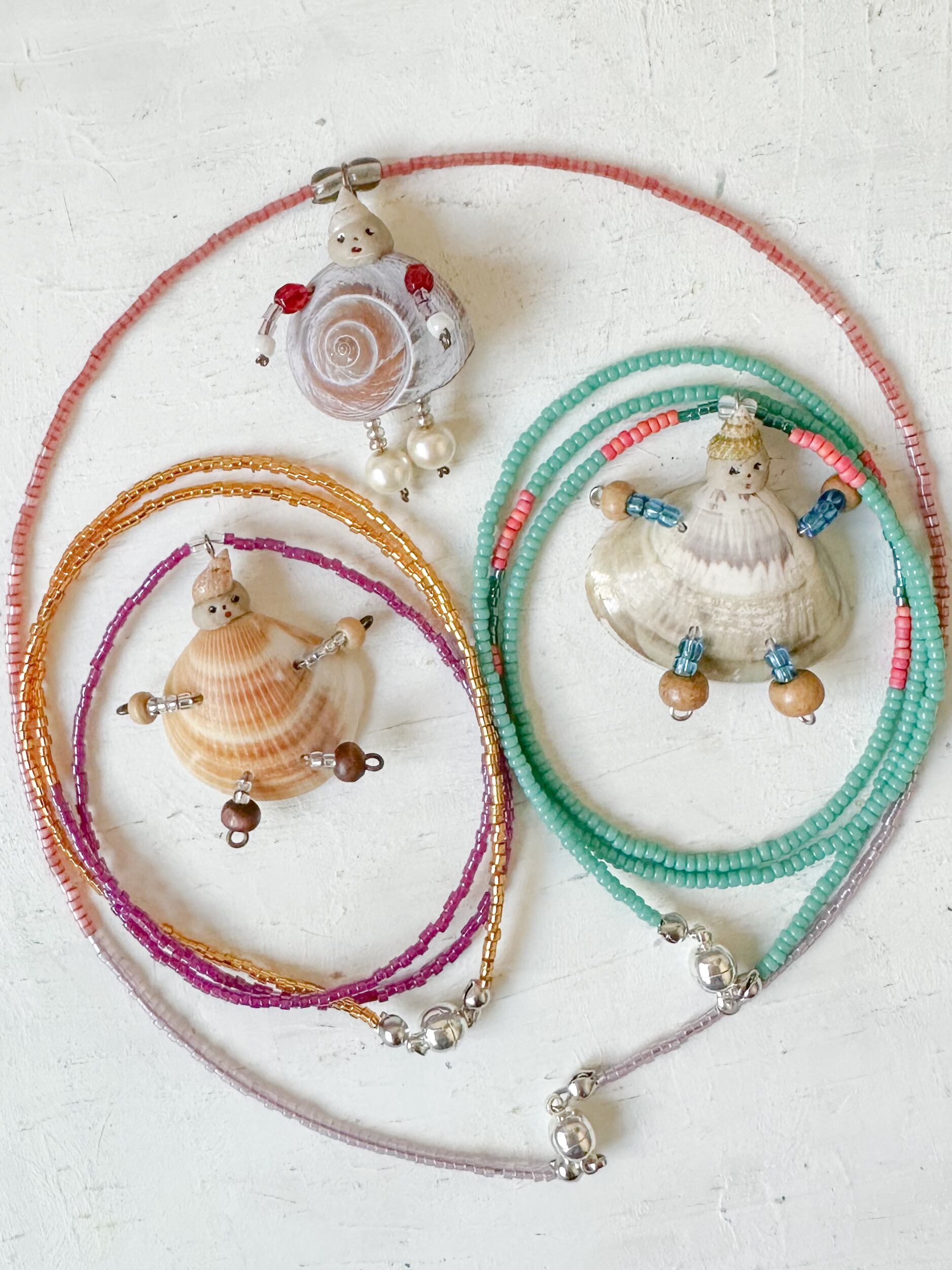 貝殻で海の妖精のペンダントモチーフをつくり、季節を感じながら選んだビーズを連ねてネックレスにしました。