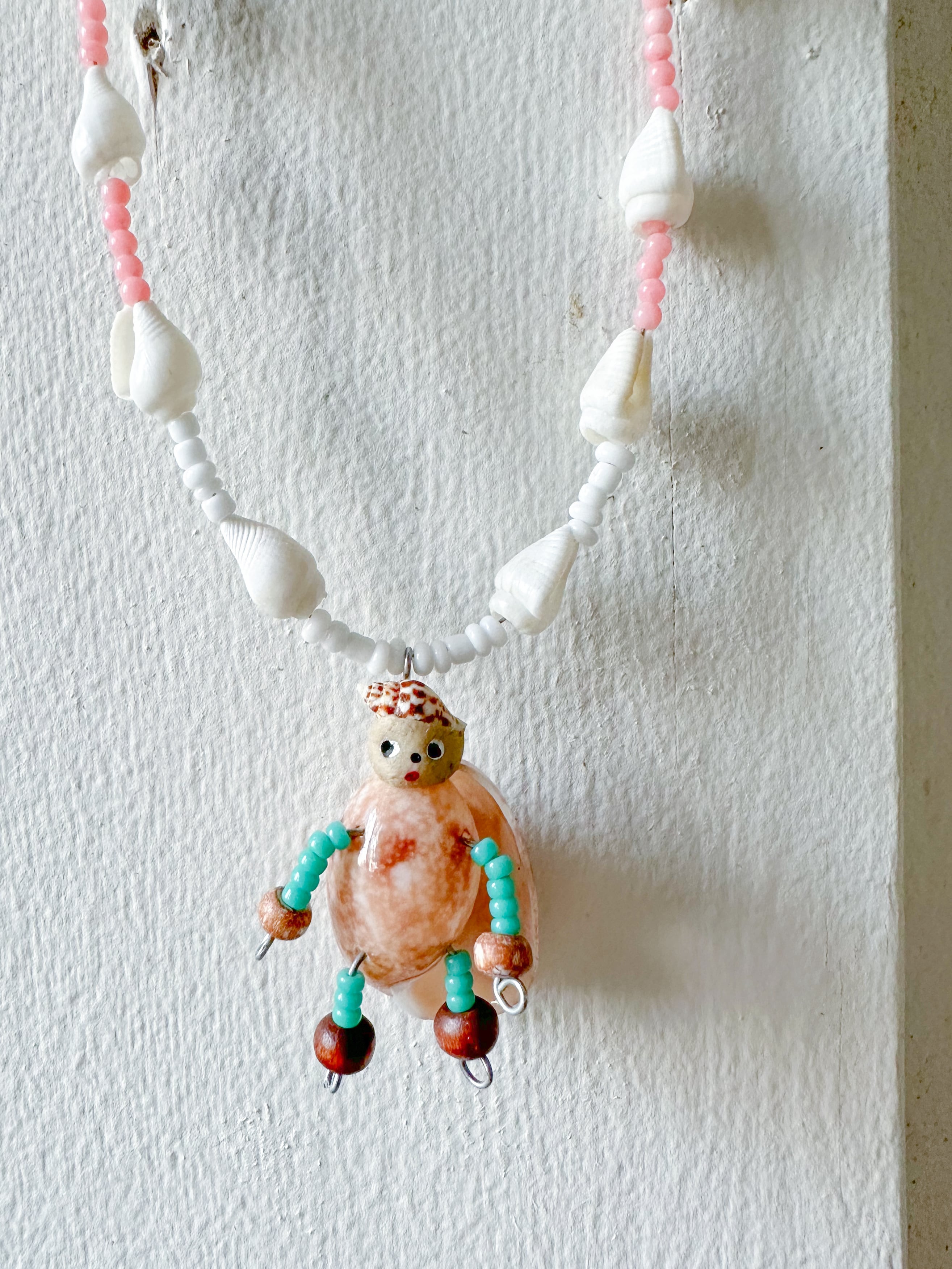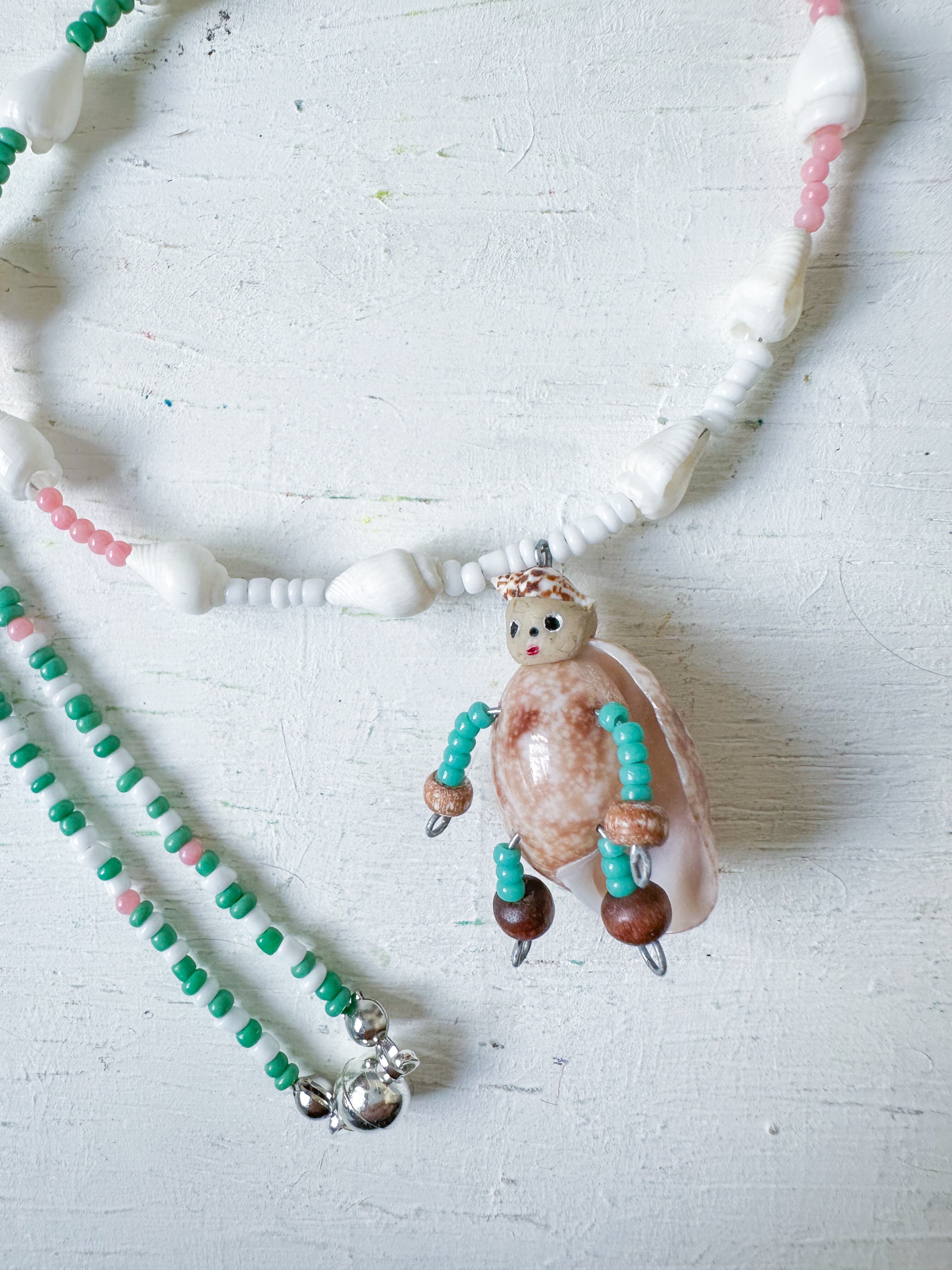 ペンダント部分は小さなナツメガイをボディに使用。腕と脚は水色とグリーンが混ざったような色合いのガラスビーズ、手足の先はウッドビーズを使いました。ネックレス部分は白い小さな巻貝と、白と緑のガラスビーズ、そして優しいピンク色の珊瑚のビーズを綴りました。おっとり無邪気な顔をしたこ。